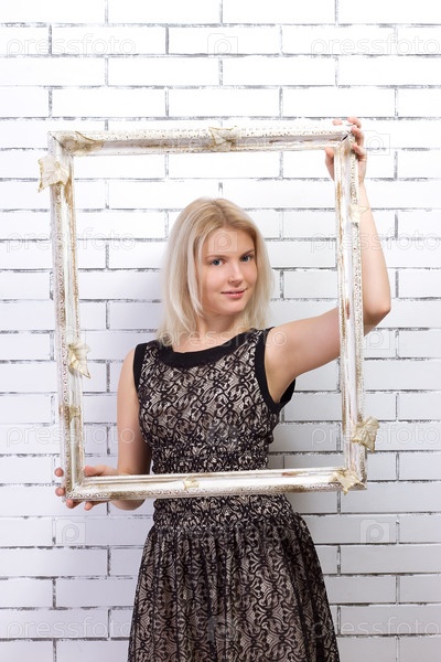 Красивая блондинка в белом платье с рамкой