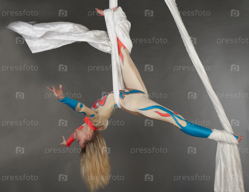 Воздушная гимнастка, девушка выполняет трюк на полотнах