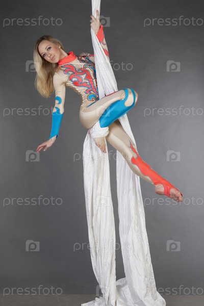 Воздушная гимнастка, девушка выполняет трюк на полотнах