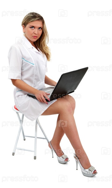 Прогрессивная медсестра в белом халате с ноутбуком