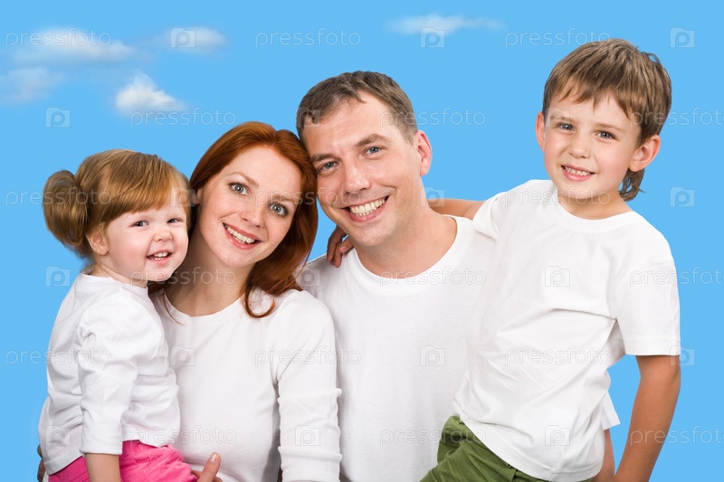 Портрет очаровательного мальчика, обнимающего своих родителей на синем фоне