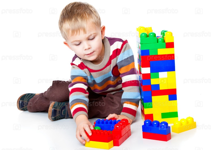 Смешной мальчик играет с конструктором