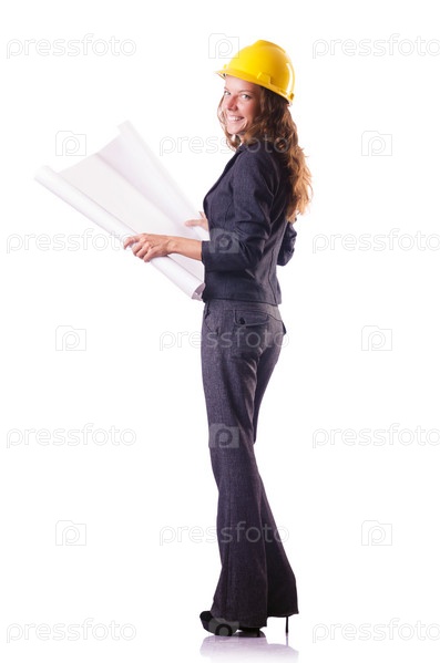 Женщина-строитель в каске на белом фоне