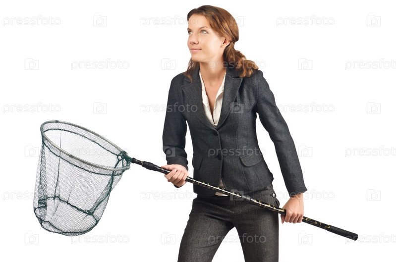 Женщина с сачком, изолированная на белом фоне