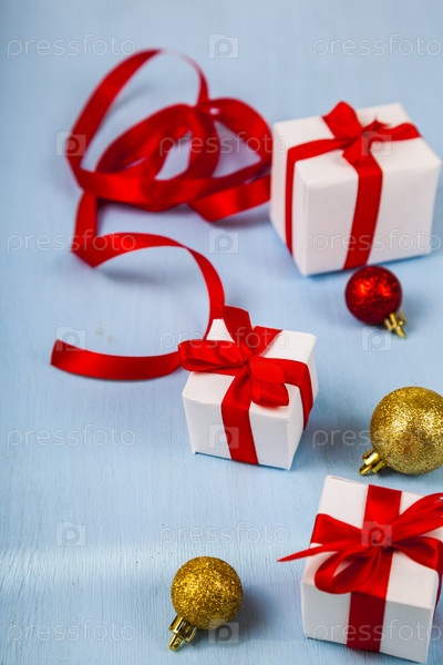 Подарки с красными бантами и рождественские украшения