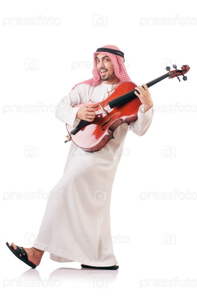 Араб с виолончелью, изолированный на белом фоне