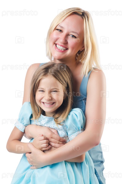 Счастливая мать и дочь, изолированные на белом