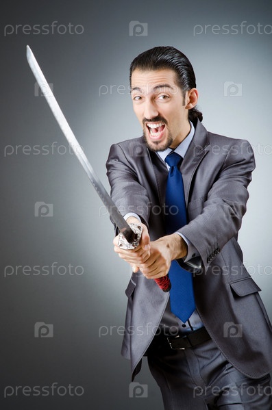 Сердитый бизнесмен с мечом в темной комнате