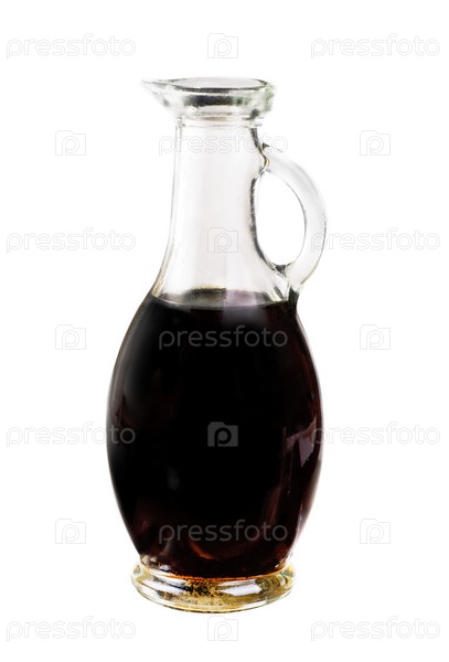 Графин с бальзамическим уксусом, изолированный на белом фоне