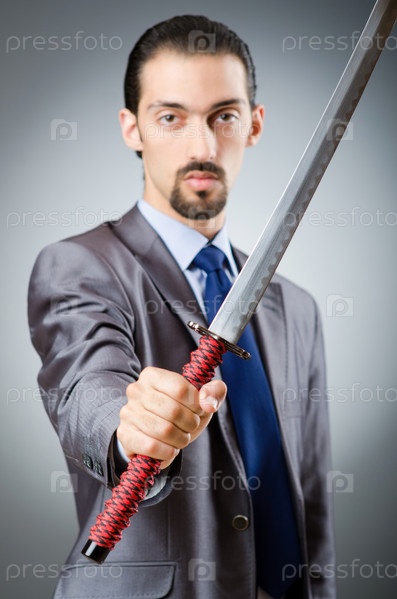 Сердитый бизнесмен с мечом в темной комнате