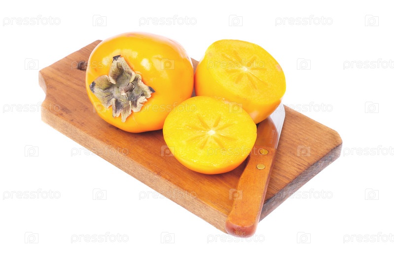Целая и нарезанная хурма на разделочной доске, изолированной на белом фоне
