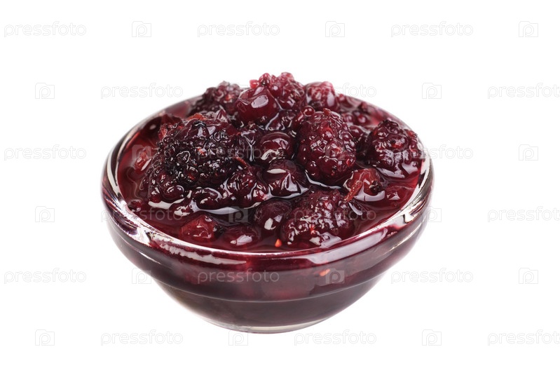Варенье из шелковицы и смородины в вазе, изолированной на белом фоне