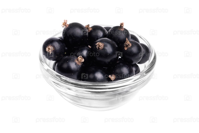 Свежая черная смородина в стеклянной емкости, изолированная на белом фоне