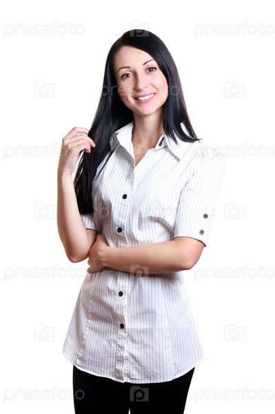 Красивая улыбающаяся брюнетка на белом фоне