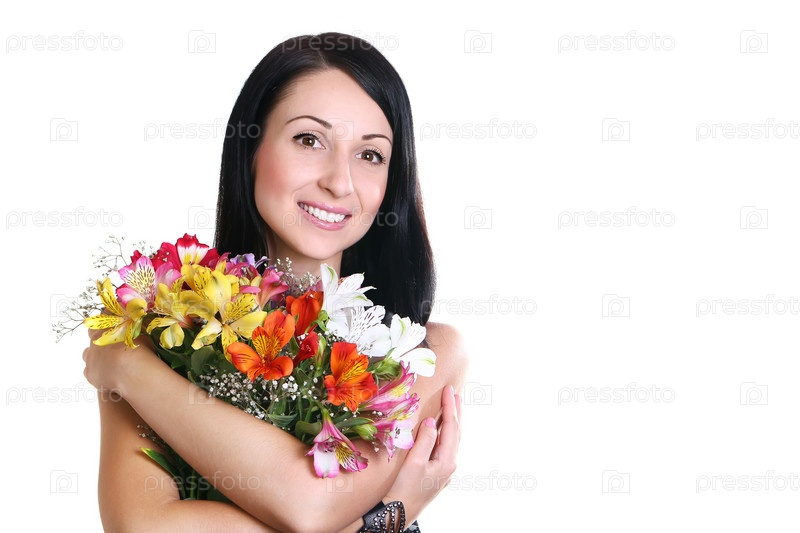 Счастливая молодая женщина, обнимающая цветы