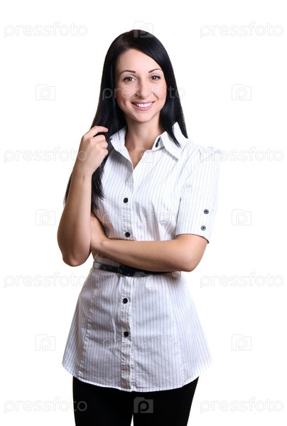 Красивая улыбающаяся брюнетка на белом фоне
