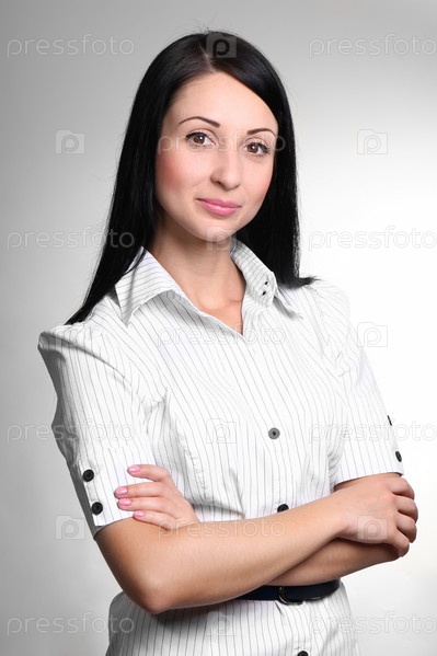 Красивая улыбающаяся брюнетка на сером фоне
