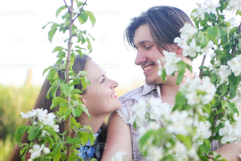 Счастливая молодая пара в цветущем саду