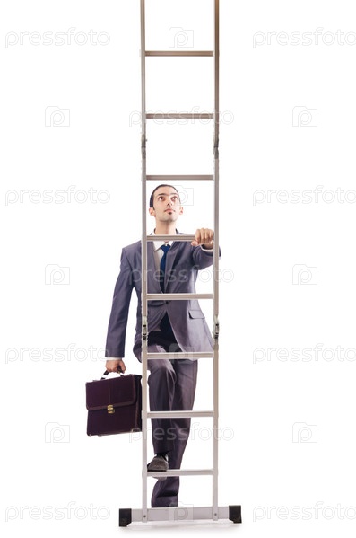 Бизнесмен поднимается по лестнице, изолированный на белом