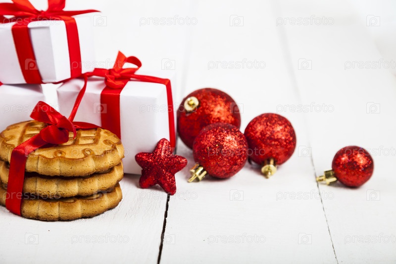 Рождественское печенье, ель, подарок и шары