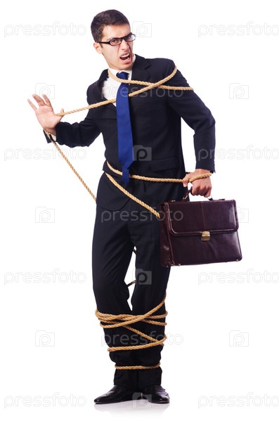 Бизнесмен, связанный веревкой, на белом фоне