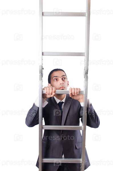 Бизнесмен поднимается по лестнице, изолированный на белом