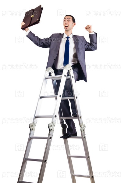 Бизнесмен поднимается по карьерной лестнице на белом фоне