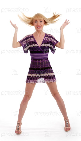 Красивая молодая блондинка в фиолетовом платье на белом фоне