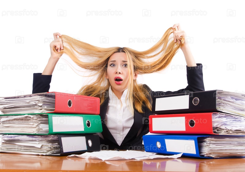 Занятая женщина со стопками документов