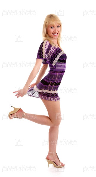 Красивая молодая блондинка в фиолетовом платье на белом фоне