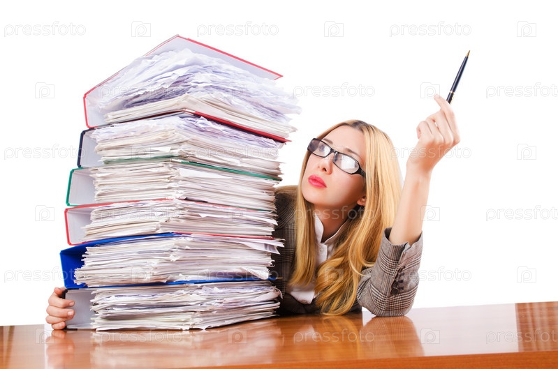 Занятая женщина со стопками документов