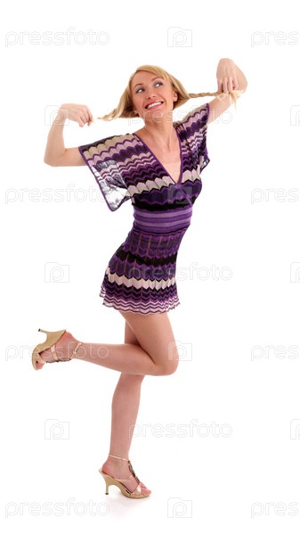Красивая молодая блондинка в фиолетовом платье на белом фоне