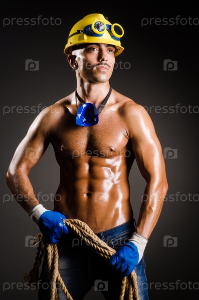 Строительный рабочий в темной студии