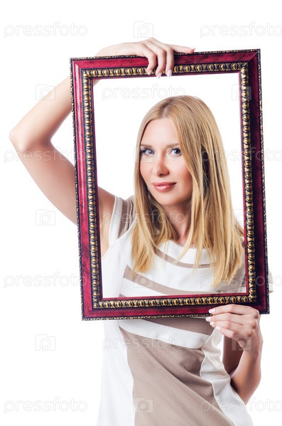Женщина с фоторамкой на белом