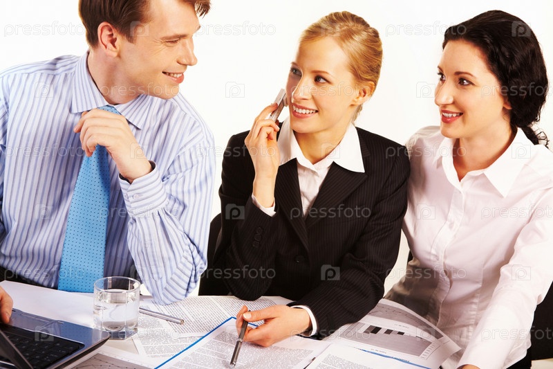 Фото трех партнеров, работающих с документами на встрече за столом, в то время как одна из женщин звонит по мобильному