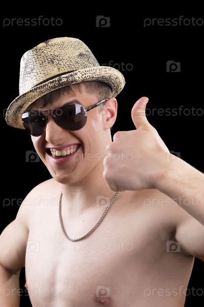 Радостный молодой человек в шляпе, показывающий большой палец вверх