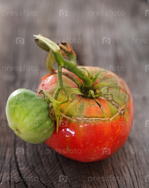 Красный помидор с каплями росы на деревянной доске
