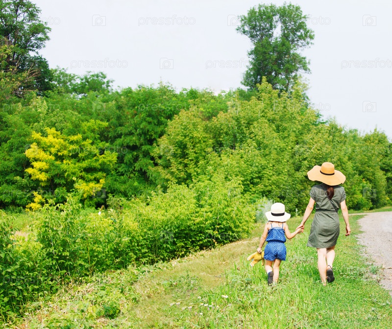 Счастливая мать и маленькая дочь гуляют