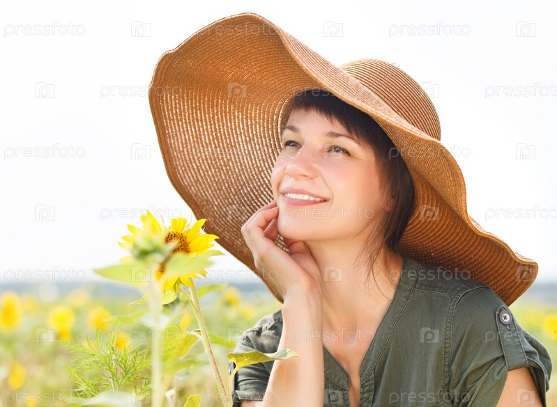 Портрет молодой улыбающейся женщины с подсолнухом