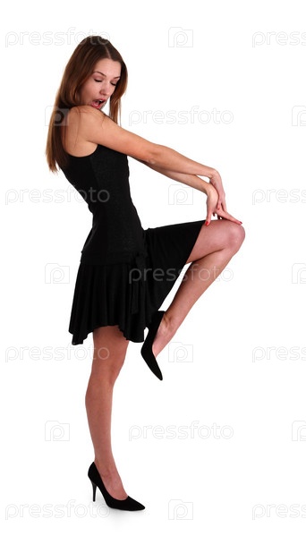Молодая девушка в черном платье на белом фоне