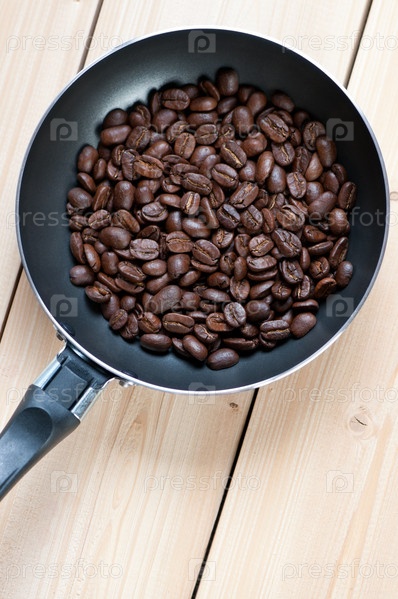 Обжаренный кофе в зернах в сковороде, вид сверху