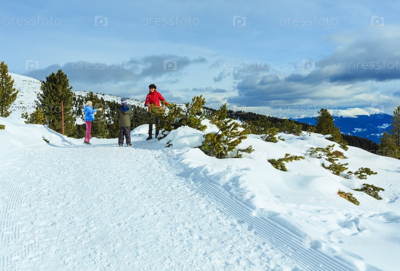 Семья играет в снежки на склоне горы зимой