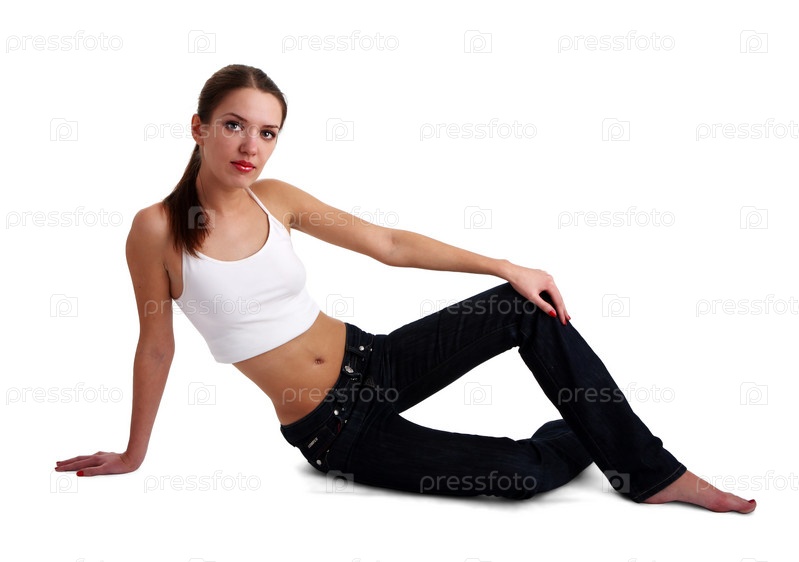 Брюнетка в коротком белом топе и джинсах