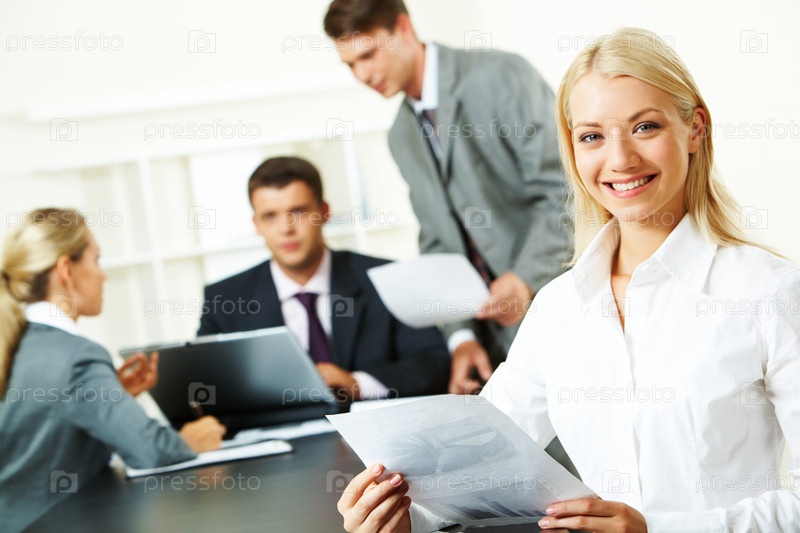 Фото успешных деловых партнеров, сидящих в мастерской и смотрящих на камеру с улыбкой