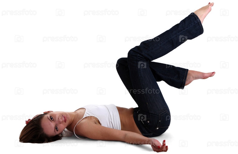 Лежащая брюнетка в коротком белом топе и джинсах