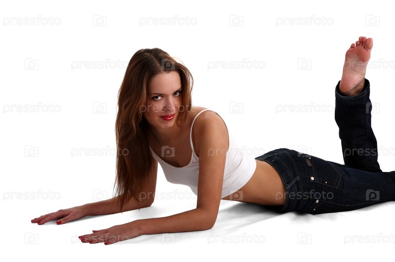Лежащая на полу брюнетка в коротком белом топе и джинсах