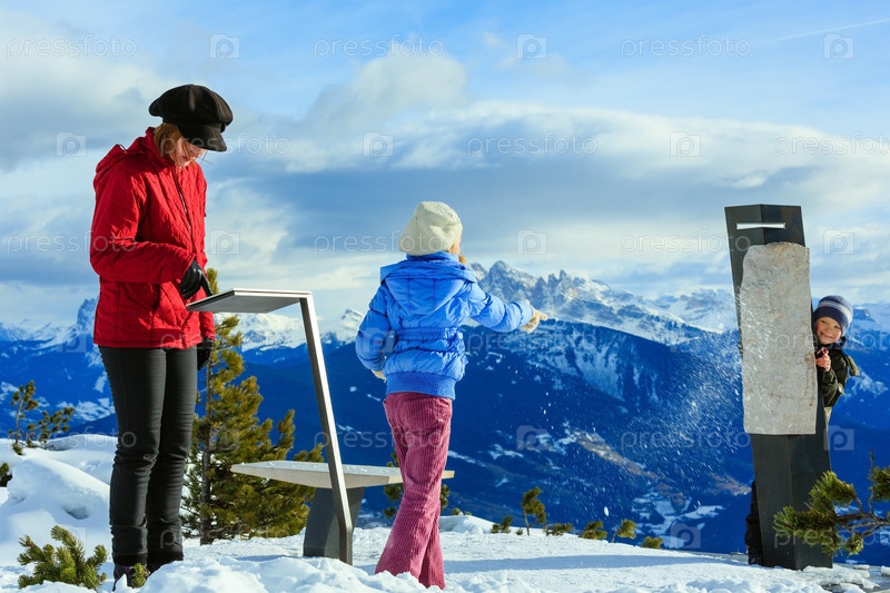 Семья играет в снежки на склоне горы зимой