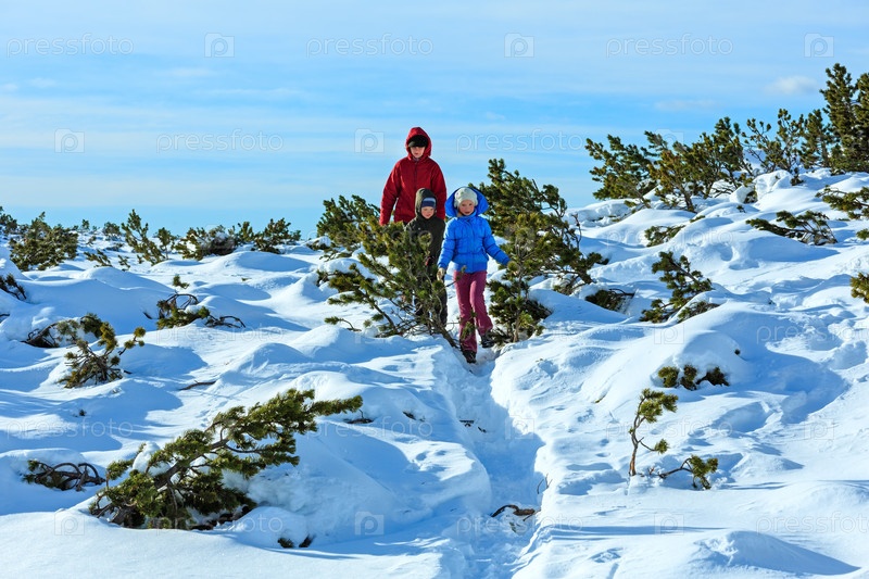 Семья гуляет на склоне горы зимой