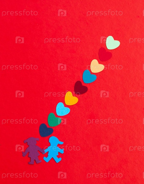 Разноцветный бумажный мальчик и девочка с разноцветными бумажными сердцами