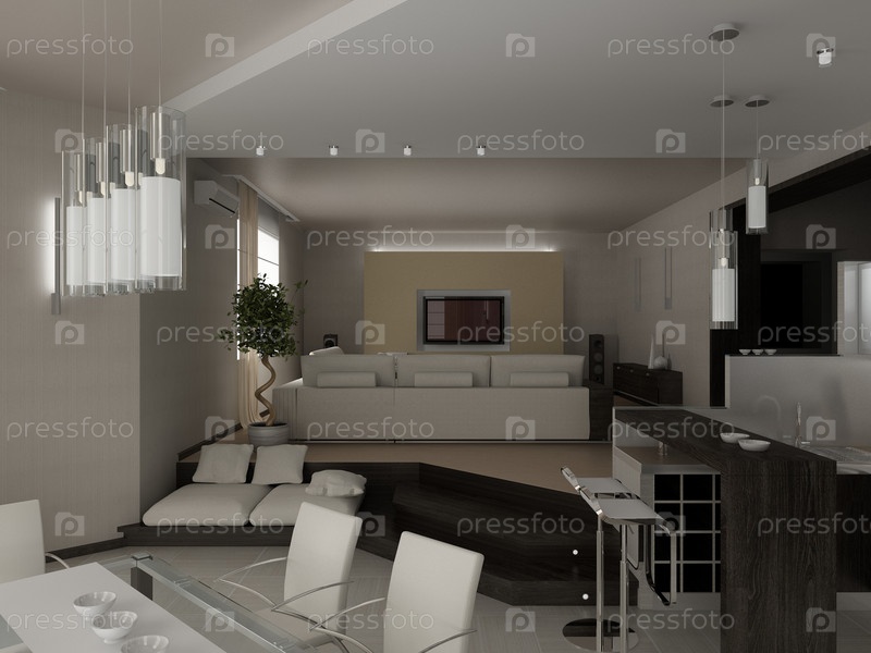 Современная гостиная с обеденной зоной, 3D